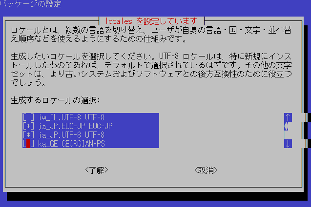Localeはこの2つをスペースで選択して決定する(この時点では文字化けするので後でフォントのインストールが必要である)